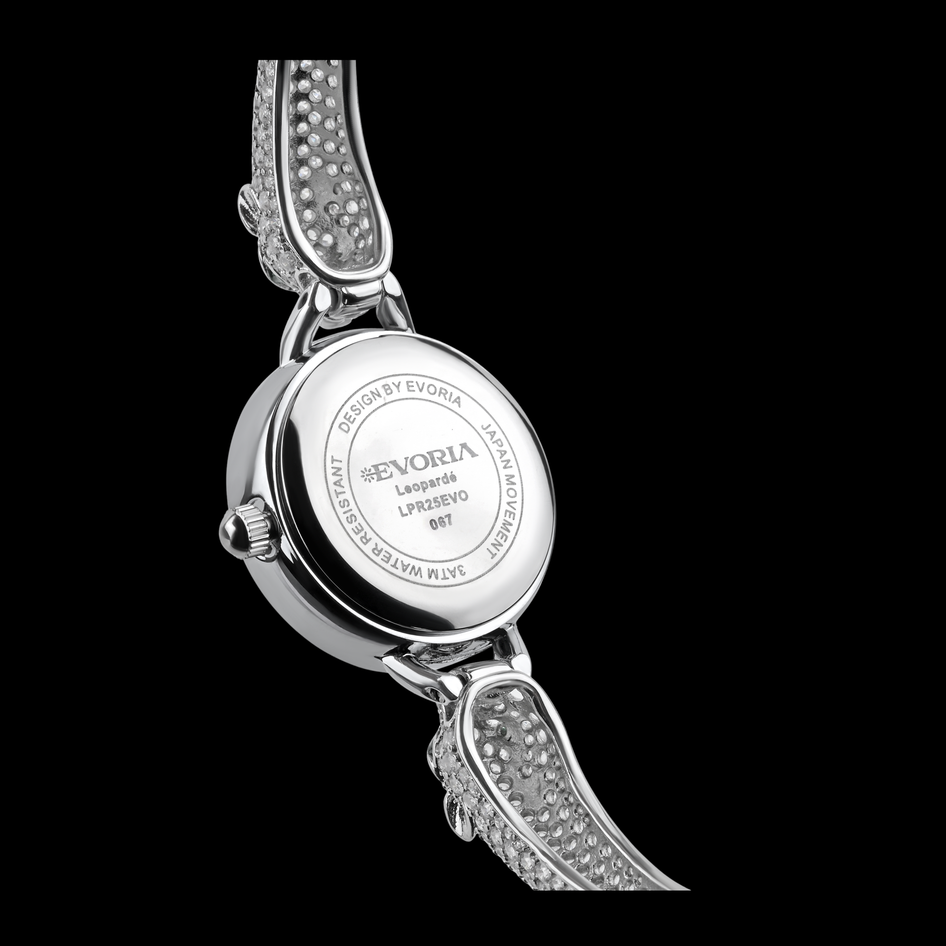 Leopardé Limited Edition by Evoria features a compact round case powered by a Japanese quartz movement. The dial is finished with a sun-patterned surface that reflects light softly, framed by a Zircon stone-set bezel for understated brilliance. A polished crown completes the silhouette, while strengthened mineral glass with anti-reflective coating ensures clarity and durability.